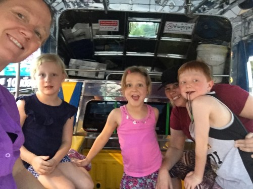 Song teow rides were hot, fun and exhilaratingly dangerous – a totally different sensory experience for our Aussie suburban kids – with a chance to see how local kids get to and from school (staring at their smartphones too, just not buckled into an SUV with seventeen airbags). By luck, Bug met some fellow Scouts on board and happily exchanged left-handed handshakes and salutes.